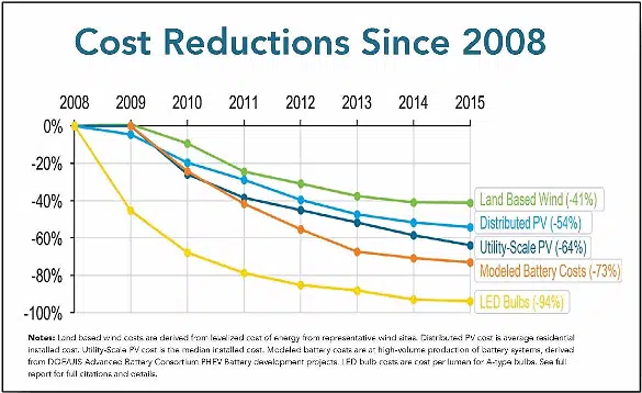 Since 2008 and to the end of 2015, the cost of on-shore wind energy fell by 41%, the cost of rooftop solar dropped 54% and utility scale solar costs decreased by 64%.