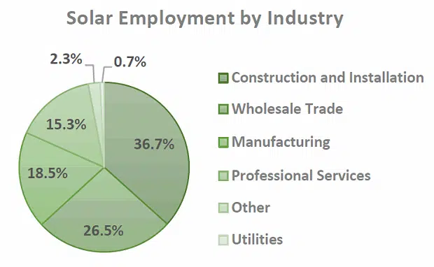 According to the report, 373,807 Americans spend time working in solar manufacturing, installation, distribution, or providing professional services to the sector. Most of these employees are involved with solar PV technologies and just over 9% work in concentrating solar technologies.